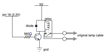 Here is the circuit diagram for the relay board - we drive the relay coil from the 5V supply which is switched on and off using a transistor controlled by one of the digital out pins (I used pin 18). The diode prevents reverse voltage as the relay switches off from damaging the Pi.