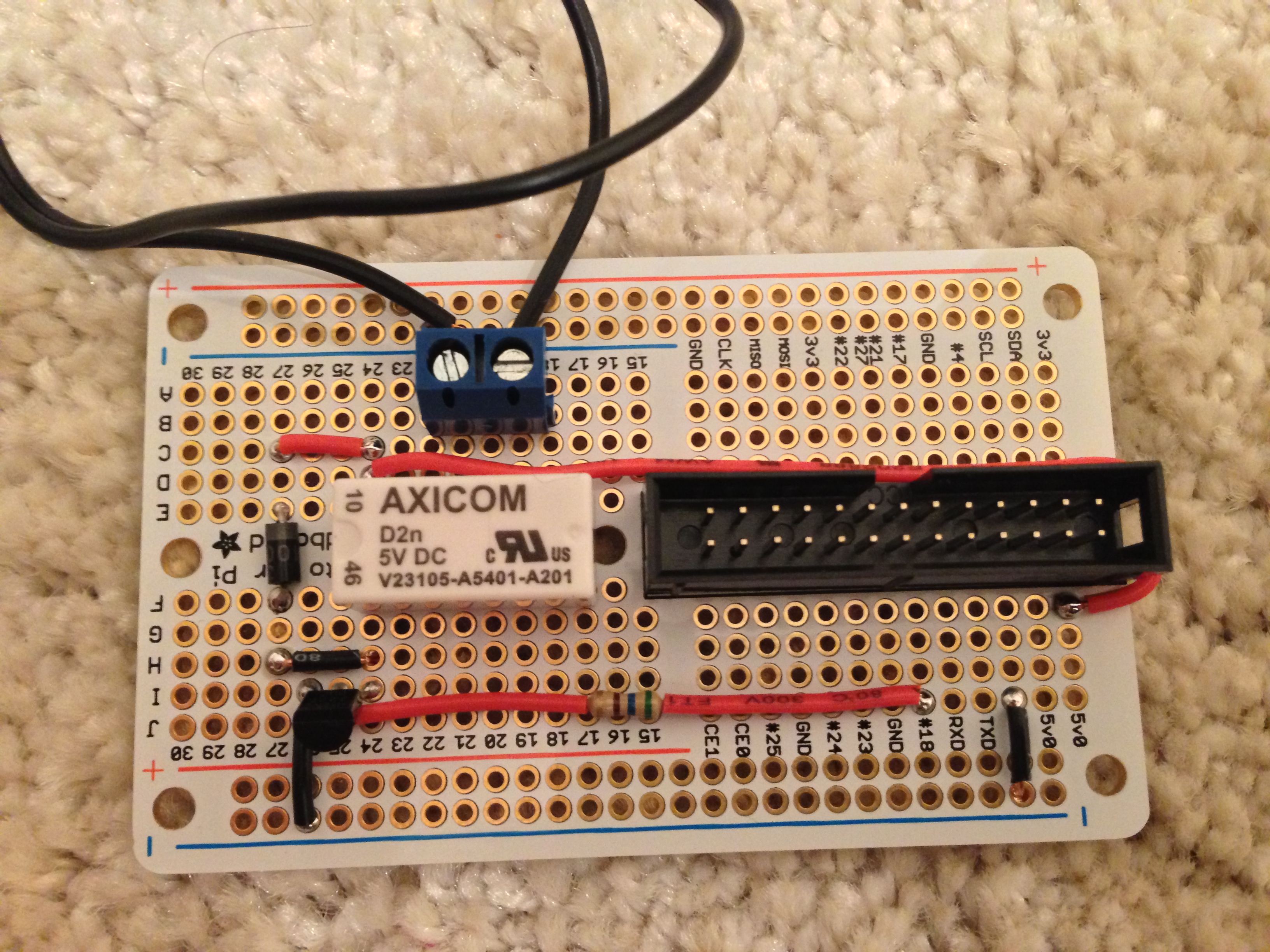 The relay board connects to the Raspberry Pi General Purpose I/O (GPIO) pins via a ribbon cable. Adafruit sells a Pi Cobbler which makes it easy to break out the GPIO pins on a breadboard for prototyping. Once you’re happy that the prototype is working, transferring a breadboard layout to the permaproto board is quite simple (the soldering is easy and you just copy what you had on the breadboard).